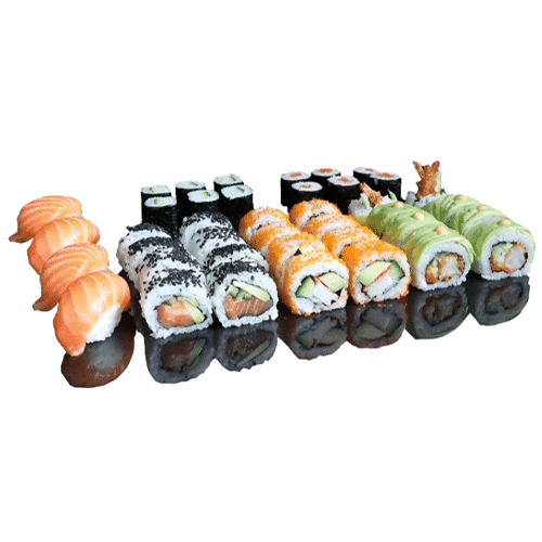 40 stuks. Uramaki tempura ebi, uramaki California, uramaki chicken, maki zalm, maki komkommer en nigiri flamed salmon cheese